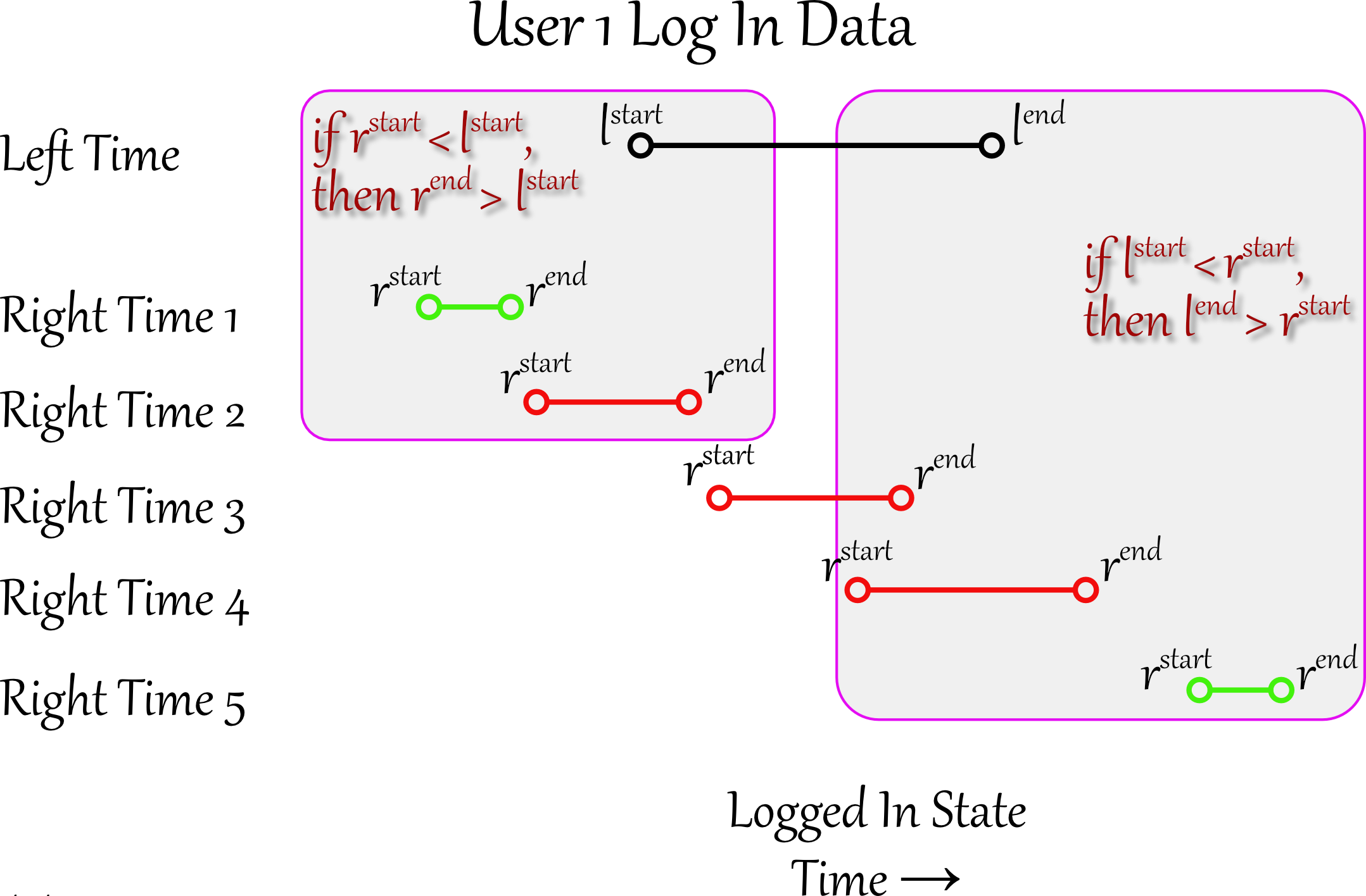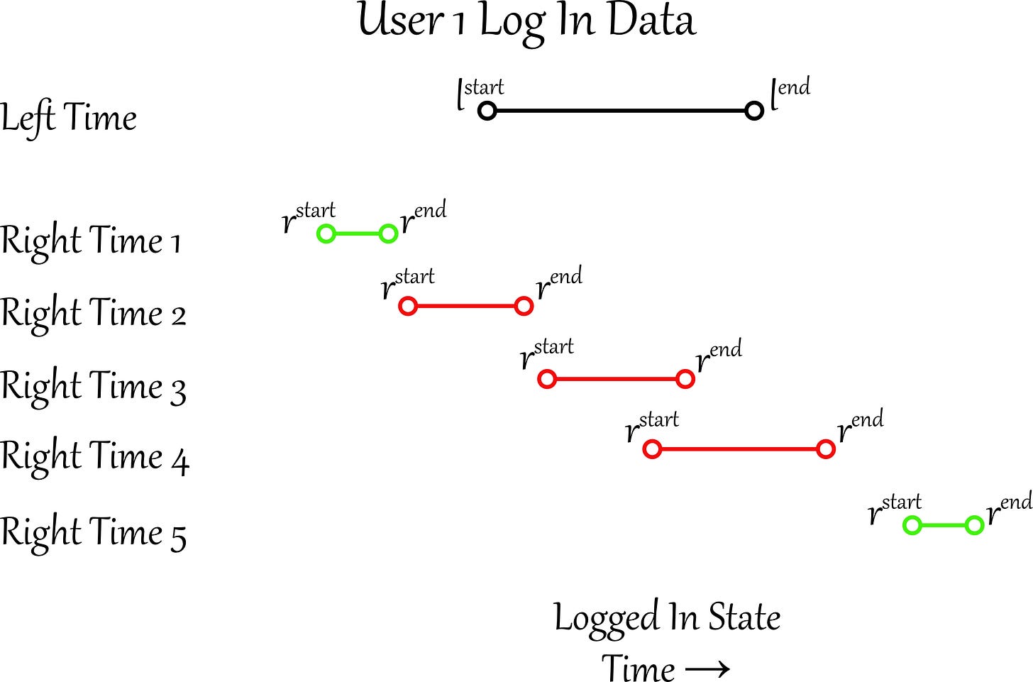 Red time periods are overlapping log in time periods - if such instances happen from different IP addresses, then the user’s credentials are compromised. Green time periods are non-overlaping and are valid entries.